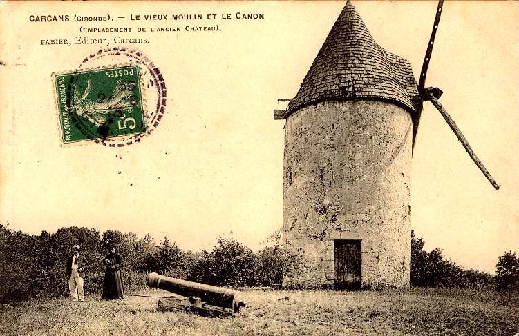 Le Moulin : Il fut construit à l’emplacement de ce qui est appelé le château. La première mention officielle de ce monument date du 15 juillet 1627 qui en ces termes disait : « Le duc de Grammont, sire de Lesparre, cède fief à Monsieur ARBOUET le moulin appelé du château, étant à présent basti de pierre du côté du couchant ». Cet édifice est resté dans la famille d’ARBOUET jusqu’en 1761. En 1803 Monsieur Jean Bon en devient propriétaire. Plus tard l’Abbé Bertruc, curé de Carcans, se met a étudier les « armes » figurant au-dessus de la porte d’entrée qui servait de linteau et y voit un écu surmonté d’une couronne à 9 branches perlées, au centre un pin sur lequel s’appuient deux animaux dont unloup et un lion. La question se pose : seraient-ce des armes anglaises ? Olivier de Marliave , journaliste et auteur de nombreux ouvrages sur la région, décrit une fontaine miraculeuse qui serait située au pied du moulin. Est-ce la raison pour laquelle nous avons tant de centenaires dans notre canton ?